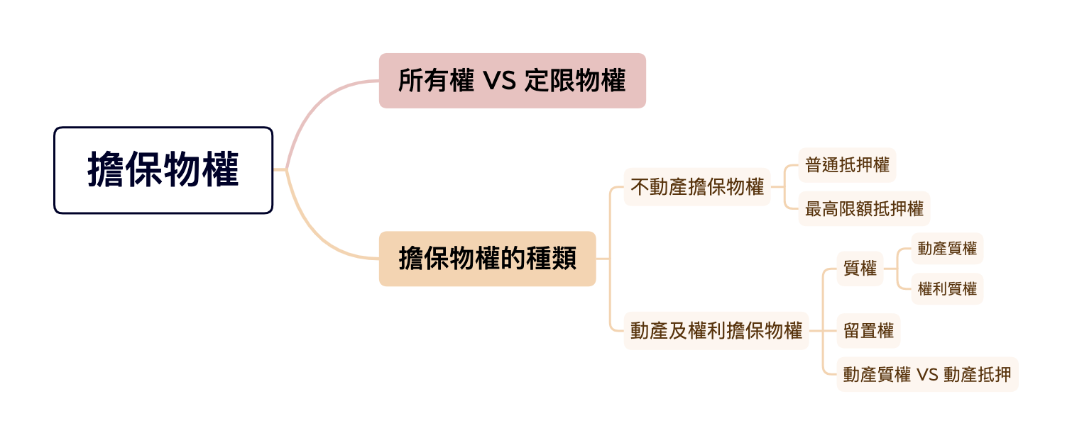 如上所述,針對物的「交換價值」為支配,主要以確保債務清償為目的,於債務人或第三人之特定「物或權利」上設定的物權。我國的民法規定,擔保物權分為抵押權、質權以及留置權。