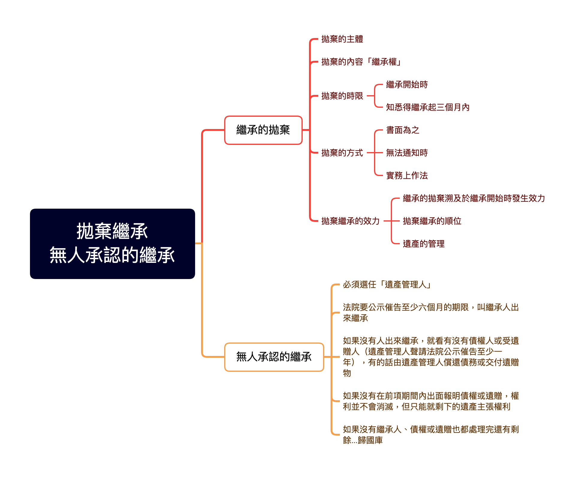上一話介紹完繼承中超級重要的「遺產分割」,接下來本話內容的重要性一點也不亞於遺產分割。遺產要分割,前提當然是有遺產才有得分割,如果沒有遺產,或是負債大於遺產,基本上除非特殊情況,根本不會有人想要繼承甚至去分割,這時除了繼承以後的限定責任以外,還有一條路可走,就是「拋棄繼承」,雖然只有短短四個條文,但在實務上以及考試上仍然相當重要。另外「無人承認的繼承」雖然條文比較多,但基本上在實務上並不是那麼重要。